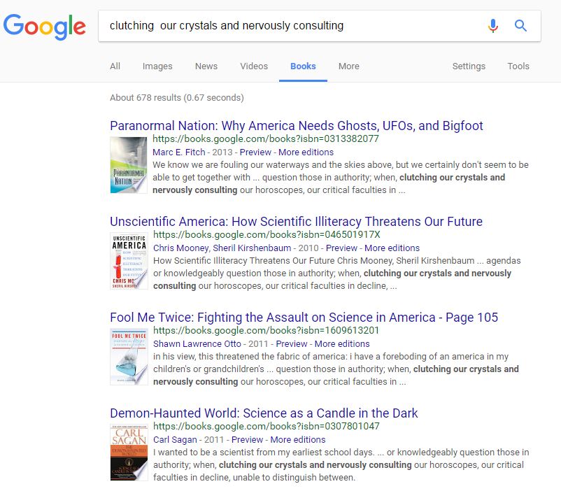 So we go to Google Books and we pick out just a short snippet of unique phrasing. I’m going to choose “clutching our crystals and nervously consulting.”